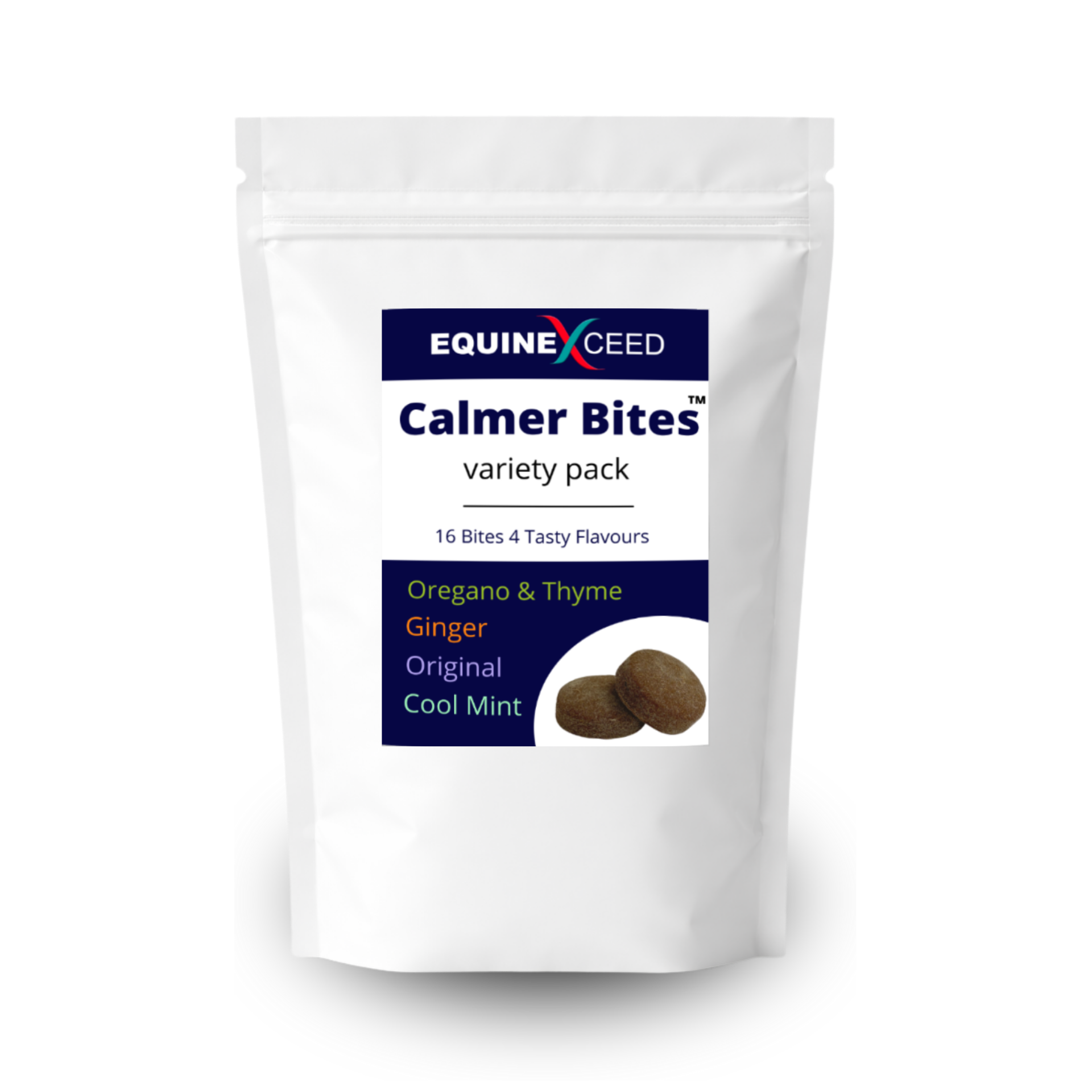 The Calmer Bite™ Variety Pack is great value and gives your horse the chance to try out all four flavours and choose their favourite. The pack contains 16 Bites including 4 Bites of each flavour. Calmer Bites™ Original, Ginger, Oregano & Thyme and Cool Bites™.