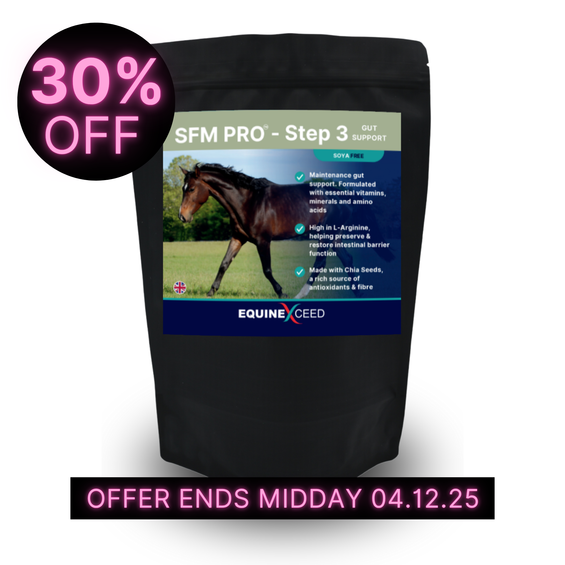 Step 3 - SFM PRO™ & SFM PRO - Extra Calmer™ is a daily gut maintenance for your horses gut health. Includes essential vitamins, minerals and amino acids, ideal for when grazing is limited, grass is lacking and throughout winter when nutrients in the grass are lower or turnout is restricted.